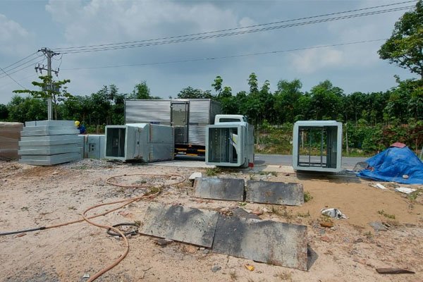 – Vật tư trạm biến áp: Vành che máy biến áp 3 tầng tole dày 3mm, mặt bít 2 đầu trụ thép 10mm, cánh cửa, đế đặt RMU, tấm lắp MCCB, pas đỡ, colier, móc cẩu,…